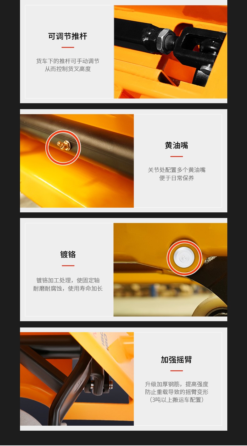 ● 所有的轉(zhuǎn)向軸都加以潤(rùn)滑,確保良好的操作性和輕松的轉(zhuǎn)向。復(fù)合套和鍍鉻的軸確保了平穩(wěn)的起升和行走,使用壽命長(zhǎng)